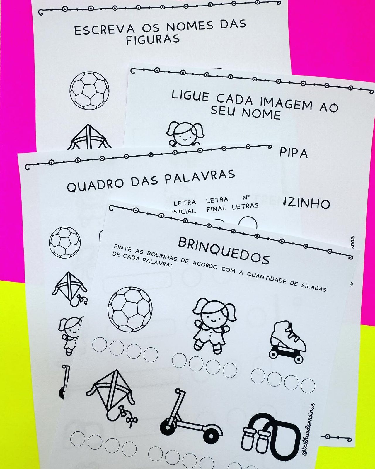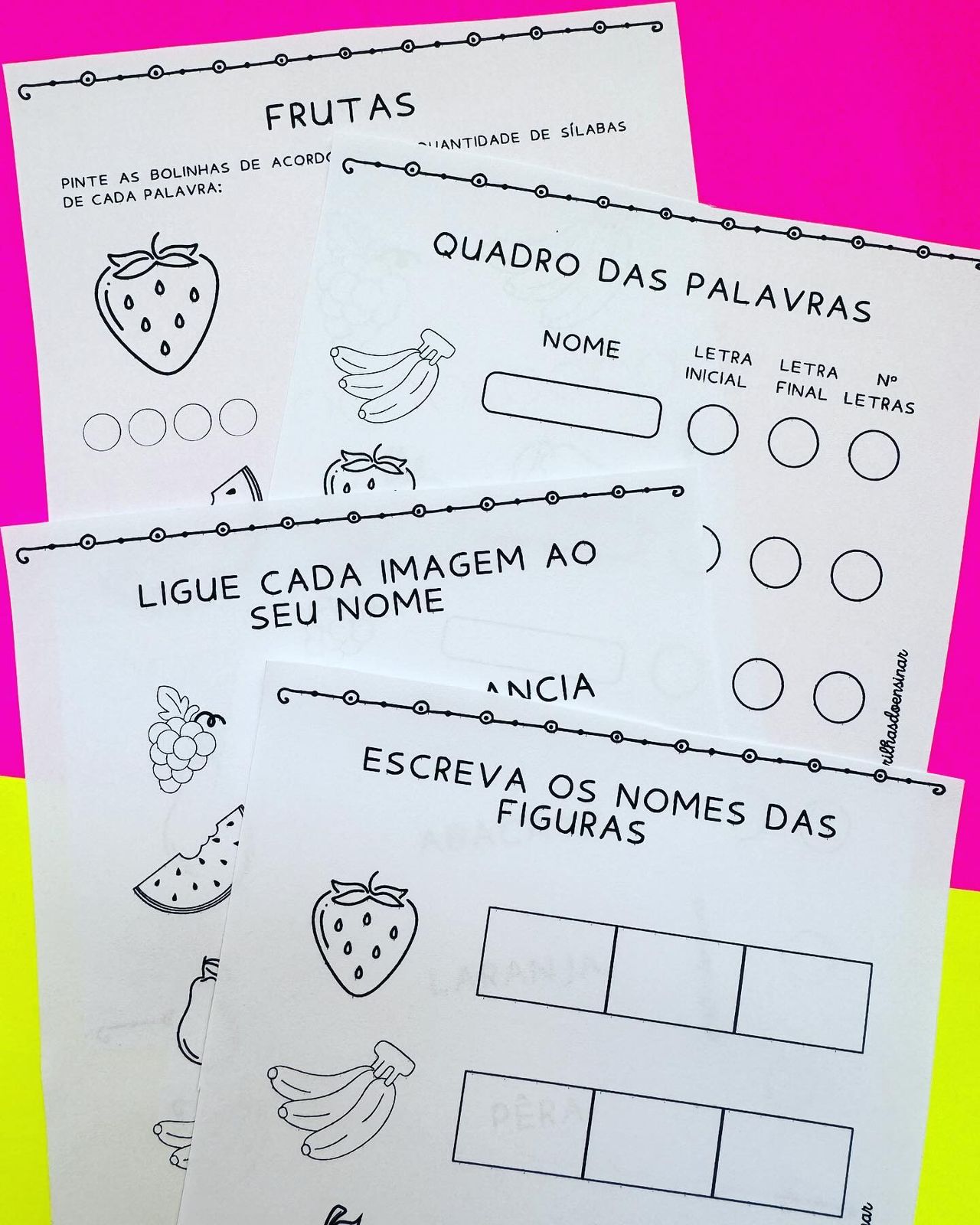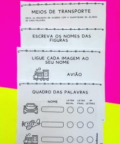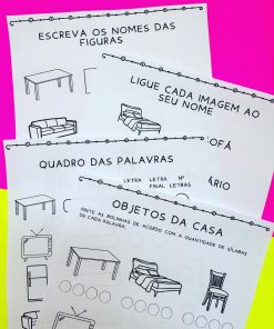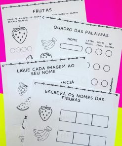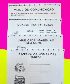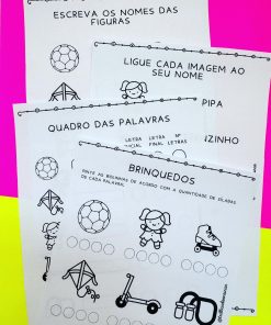 As atividades são elaboradas a partir de listas temáticas, focadas na análise de quantidade, variedade e posição das letras, associação de palavras escritas a imagens e discriminação de palavras em sílabas, aspectos estes fundamentais para o desenvolvimento do trabalho pedagógico com as crianças neste momento do processo de alfabetização.