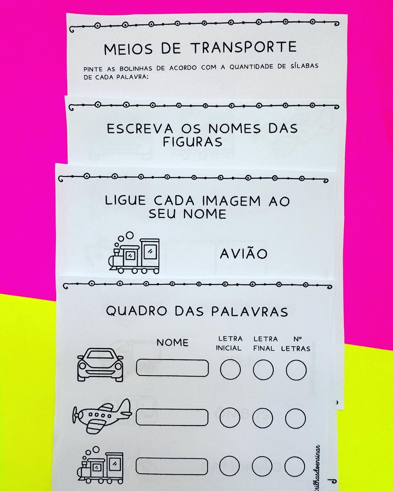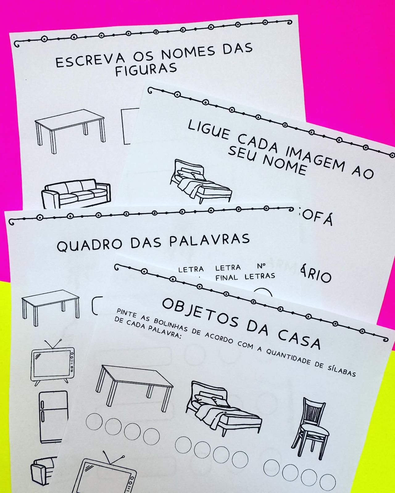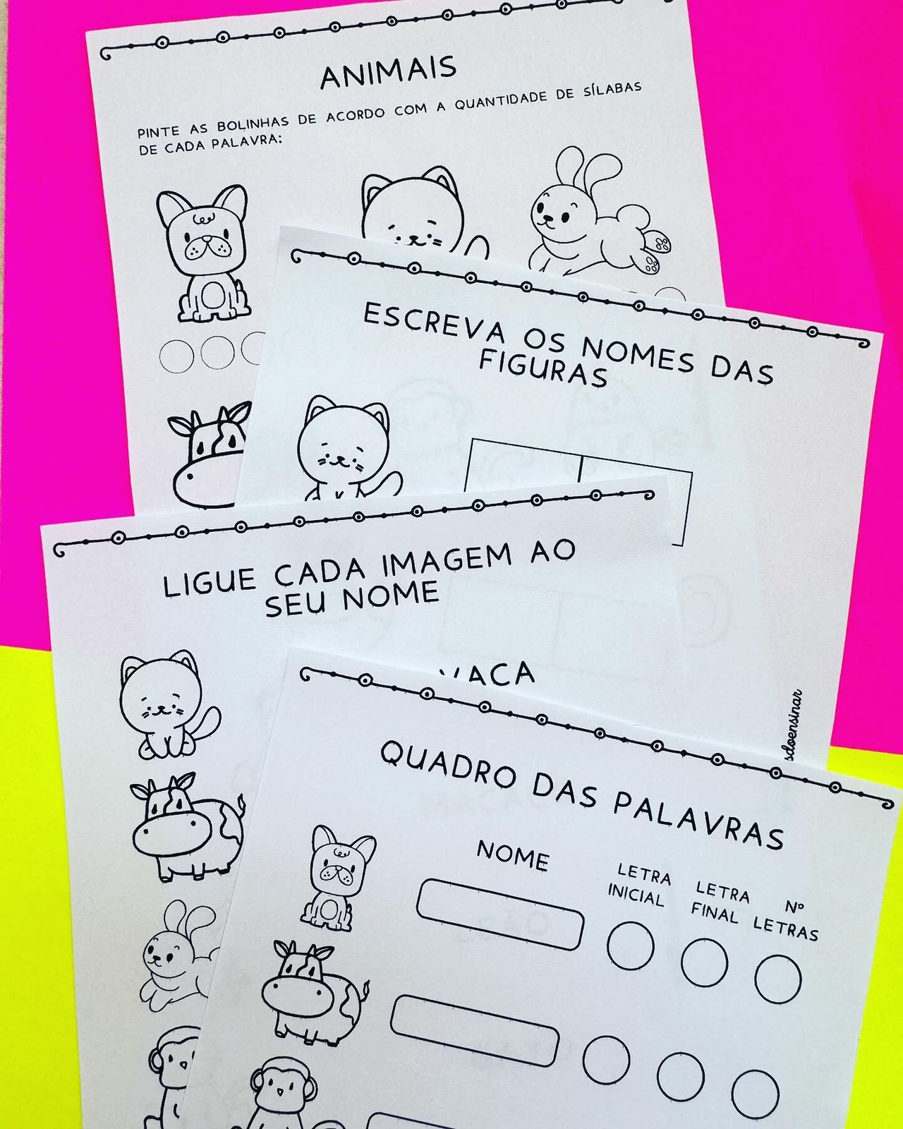 As atividades são elaboradas a partir de listas temáticas, focadas na análise de quantidade, variedade e posição das letras, associação de palavras escritas a imagens e discriminação de palavras em sílabas, aspectos estes fundamentais para o desenvolvimento do trabalho pedagógico com as crianças neste momento do processo de alfabetização.