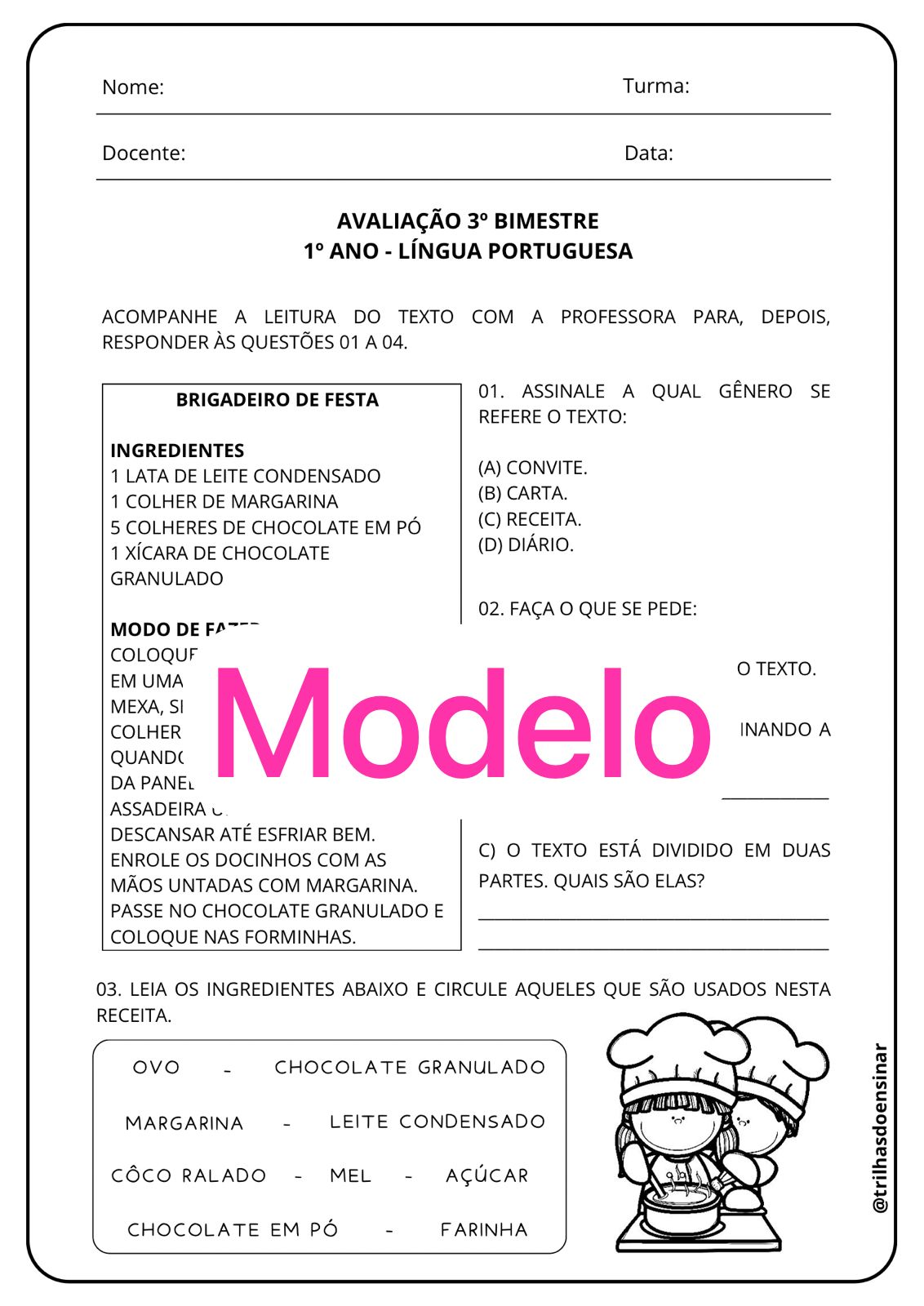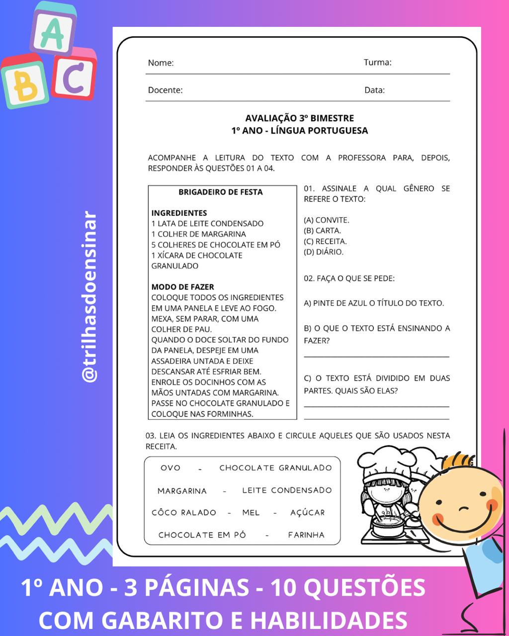1° ANO – AVALIAÇÃO DE LÍNGUA PORTUGUESA 3° BIMESTRE