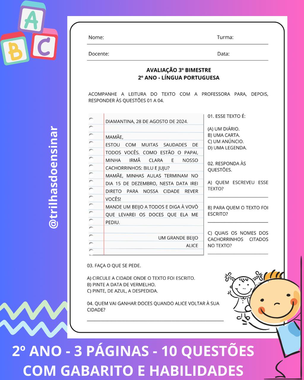 2° ANO – AVALIAÇÃO DE LÍNGUA PORTUGUESA 3° BIMESTRE
