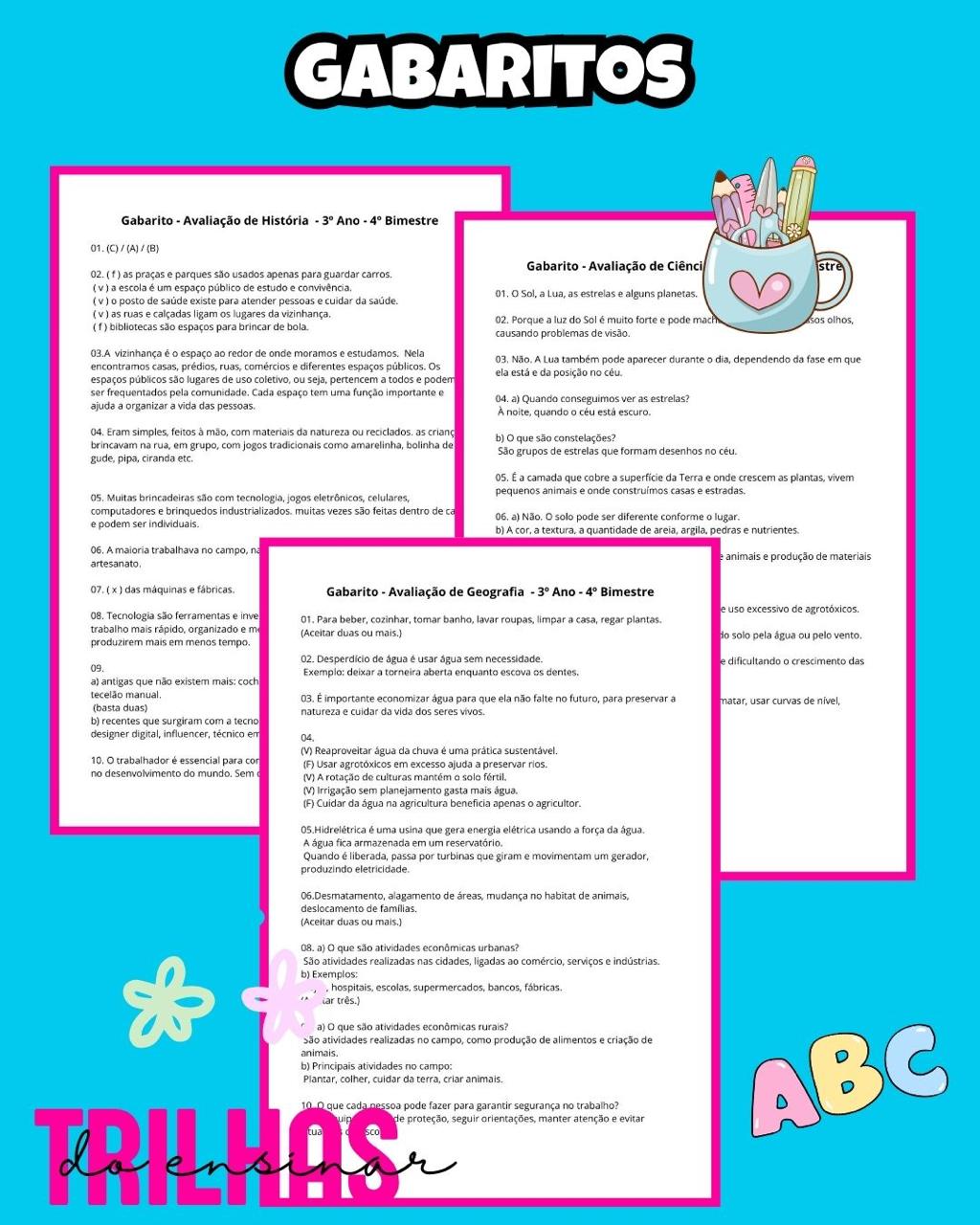 🌟 KIT AVALIAÇÕES 4° BIMESTRE / 3° ANO – HIS, GEO, CIE 🌟