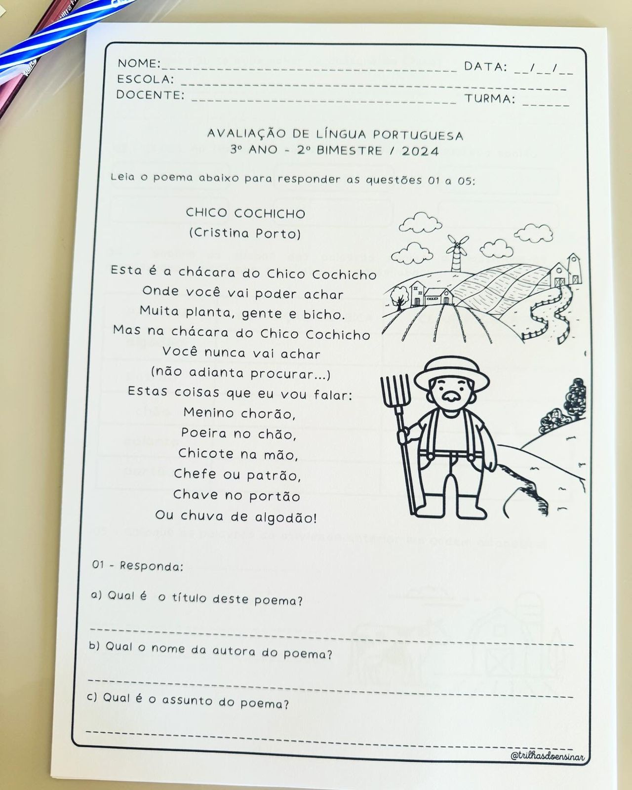 3° ANO – AVALIAÇÃO DE LÍNGUA PORTUGUESA 2° BIMESTRE