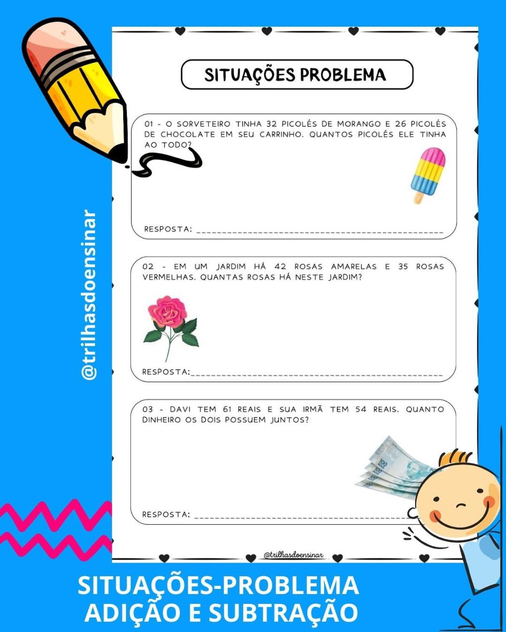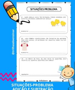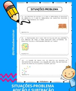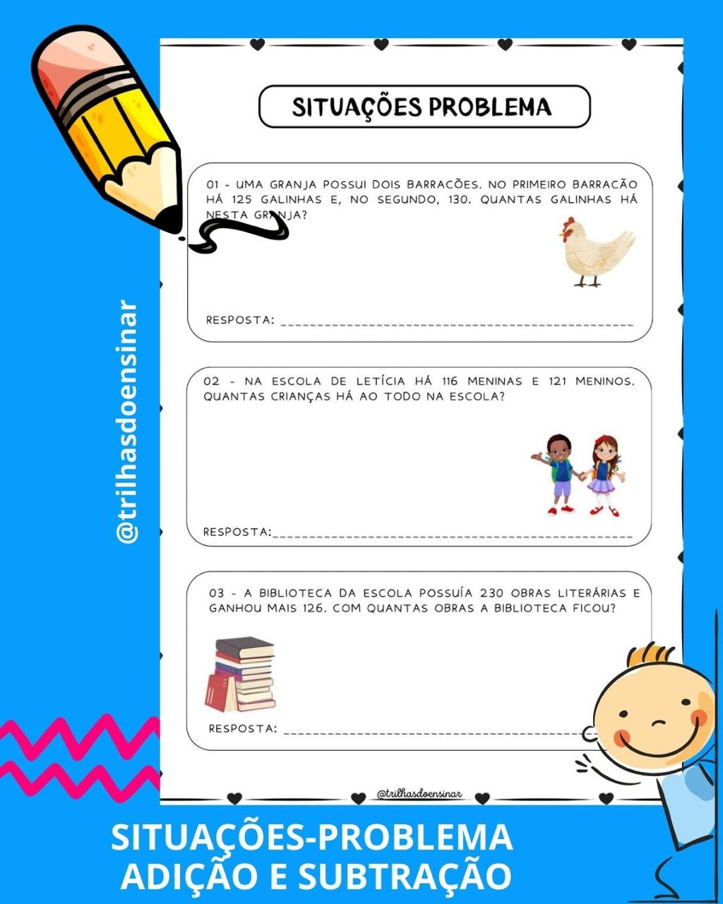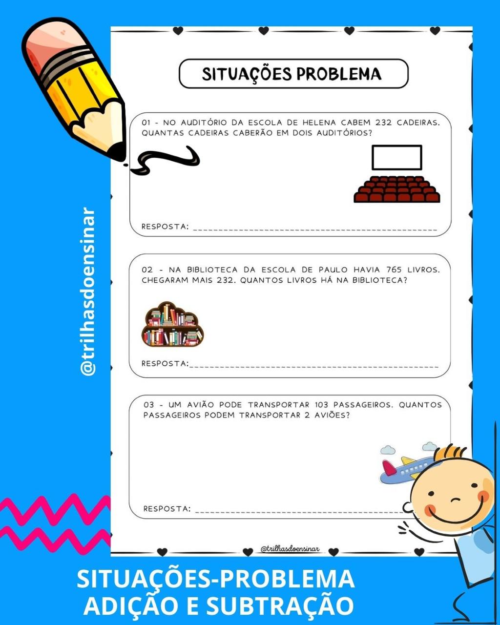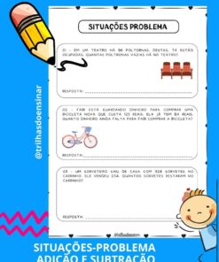 O material possui 39 situações problema inéditas além de 3 páginas de contas de adição e mais 3 de contas de subtração (unidades; dezenas e centenas). Totalizando 18 folhas de atividades + capa.