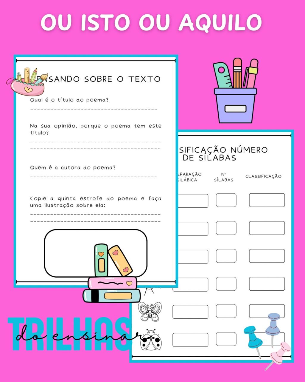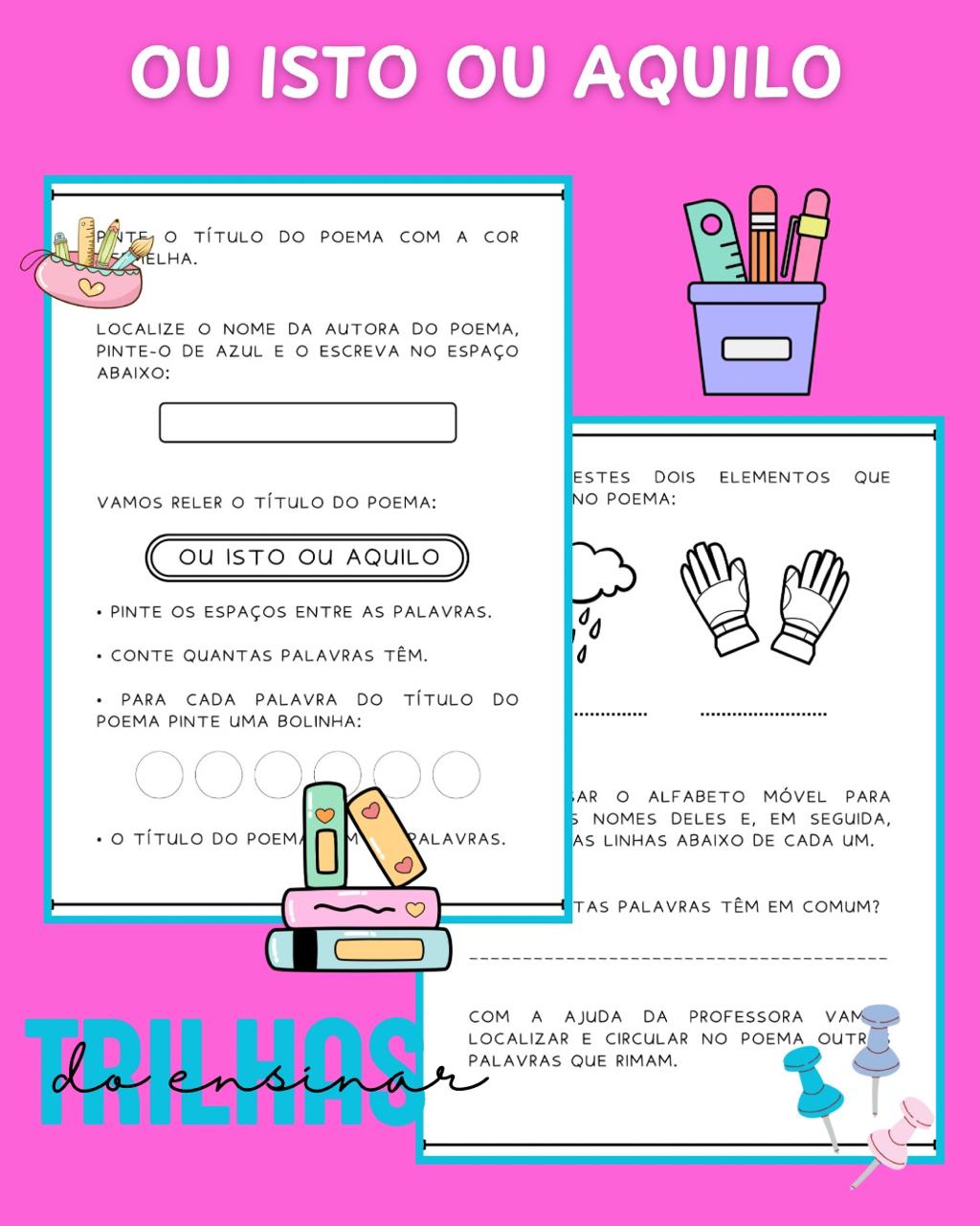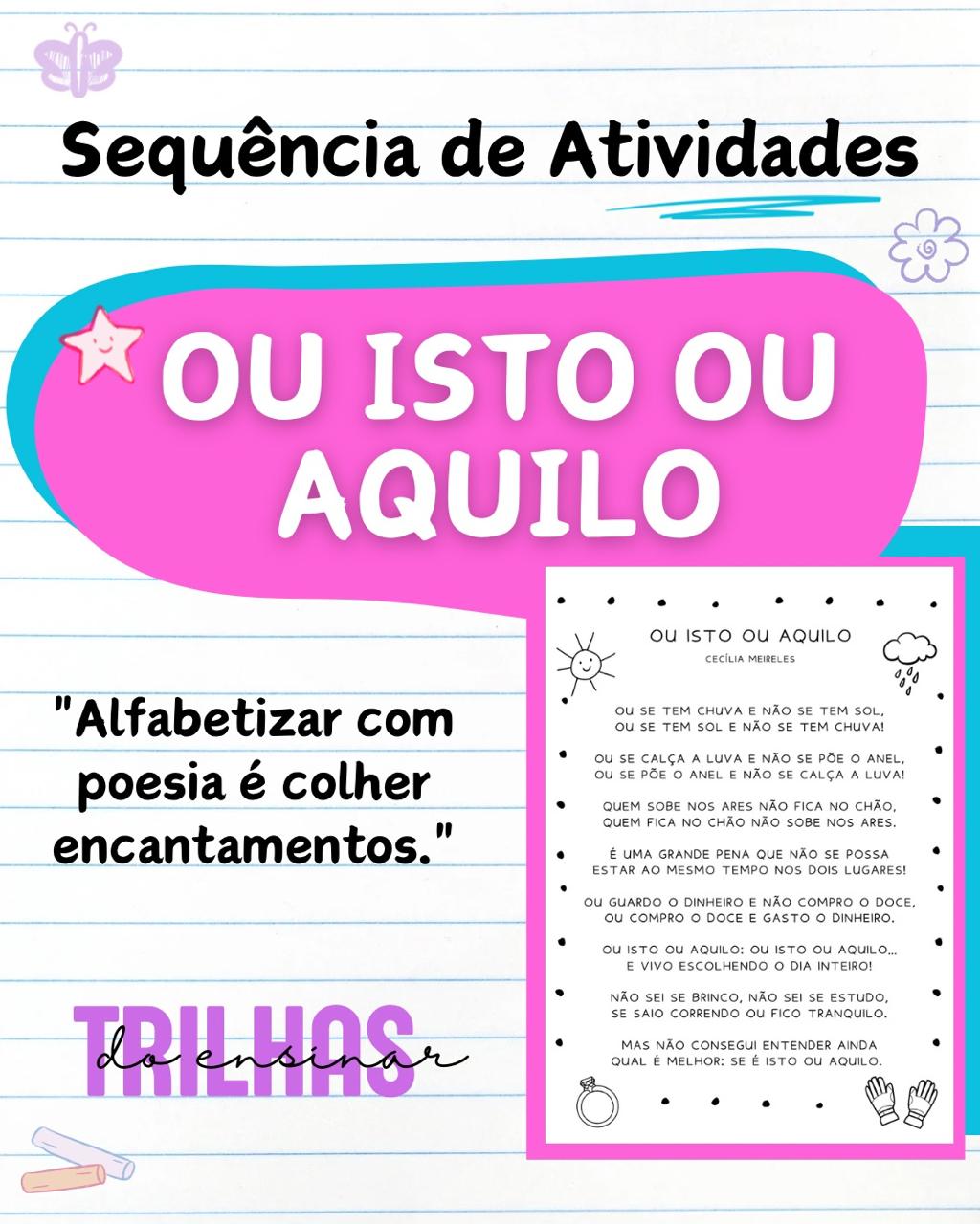 📖✨ Sequência de Atividades – “Ou Isto ou Aquilo” (Cecília Meireles), um recurso poético e pedagógico ideal para tornar a alfabetização mais rica, sensível e significativa! 🌷✏️
