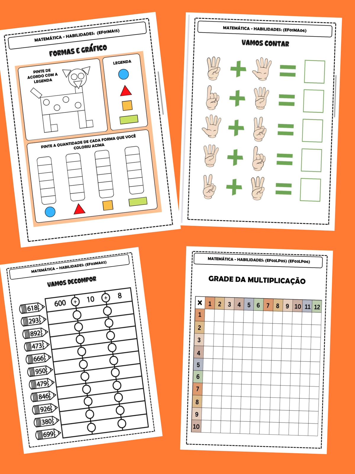 Inclui: arquivo PDF com 18 atividades totalizando 9 páginas. Voltadas para 1°, 2° e 3° anos do EF, com indicação de habilidades de acordo com a BNCC.